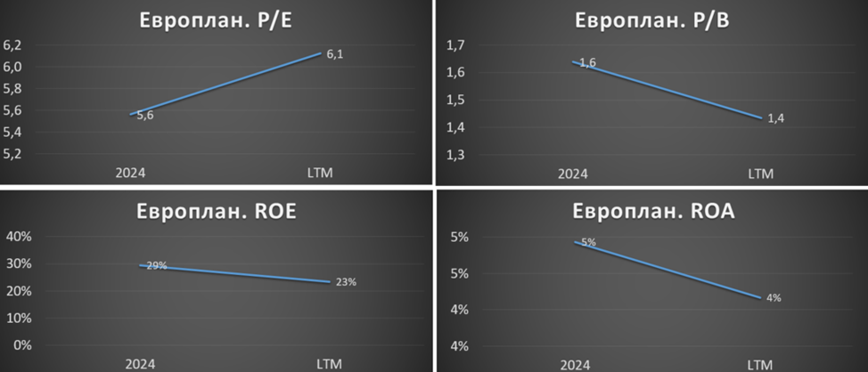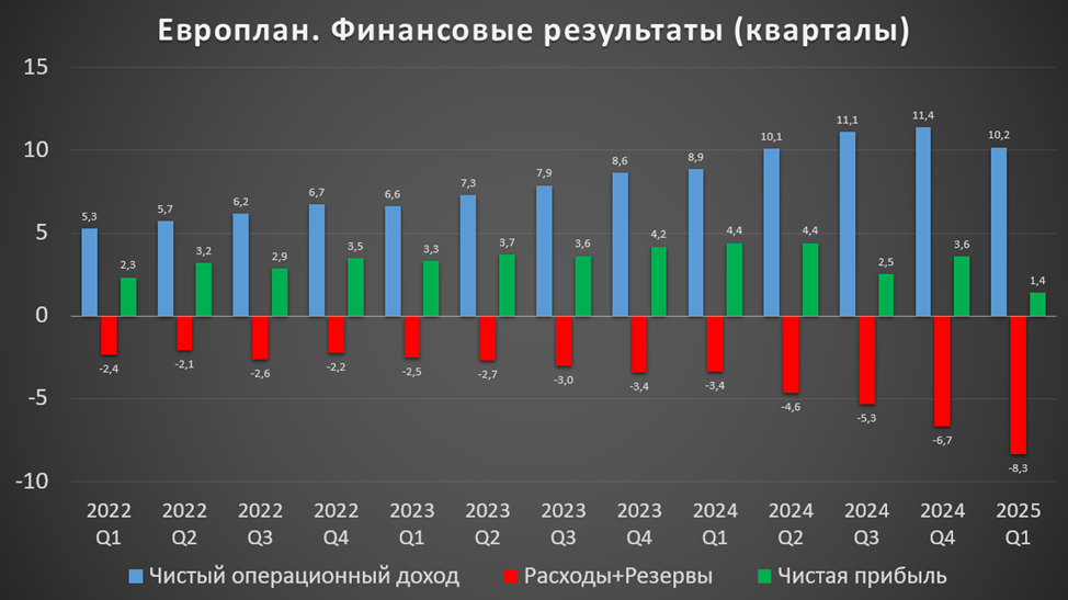 Из-за высокой ДКП, в 1Q 2025 Европлан более чем в 2 раза г/г снизил объемы нового бизнеса. Но при этом доходы показали двузначный рост. Правда, ЧП упала в 3 раза из-за резкого роста расходов на резервы.