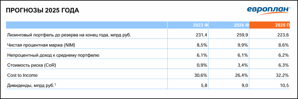 Прогнозы компании на 2025 год: лизинговый портфель -14% г/г, ЧПМ = 8,6% (-1,3пп г/г), стоимость риска 6,3% (+2,9 пп г/г), дивиденды 87,5₽ (около 14,5% доходности).