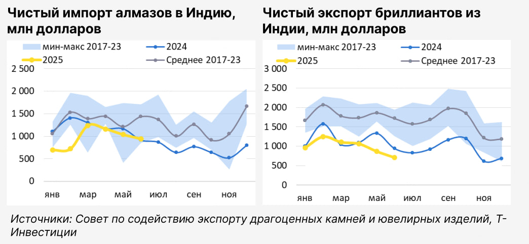 По итогам прошлого месяца чистый импорт алмазного сырья в страну составил в денежном выражении $945 млн (+2,9% г/г), а за первое полугодие — $5,8 млрд (падение на 18% г/г). Июньские данные хоть и слегка подскочили в годовом сравнении, однако были ниже среднего значения за 2017–2023 годы на 34%.