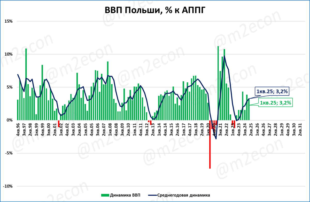 В 1 квартале 2025 года рост ВВП Польши составил 3,2% относительно 1 квартала прошлого года.