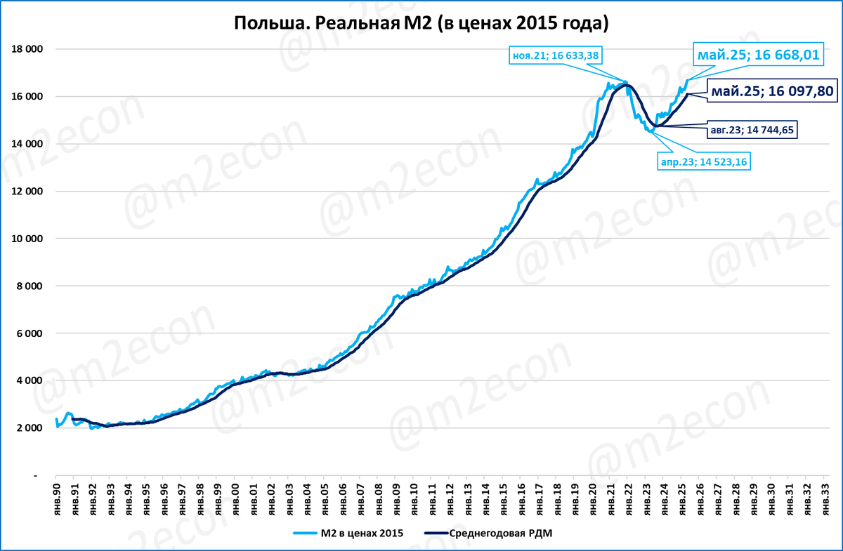 Как видно на графике, в 2022 году польский ЦБ допустил сжатие реальной денежной массы.