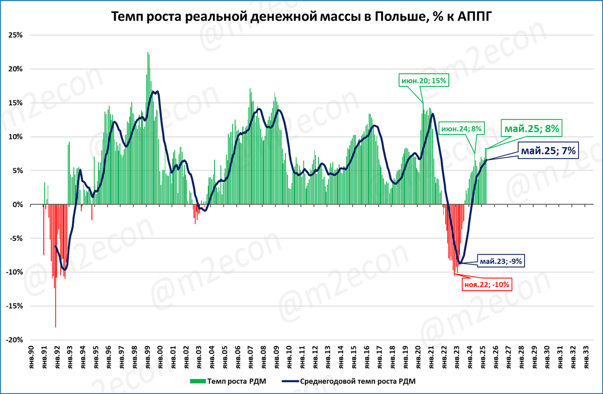 Денежная масса в Польше (+10,2% годовых) растёт быстрее цен (4,0%), а значит, растёт в реальном выражении.