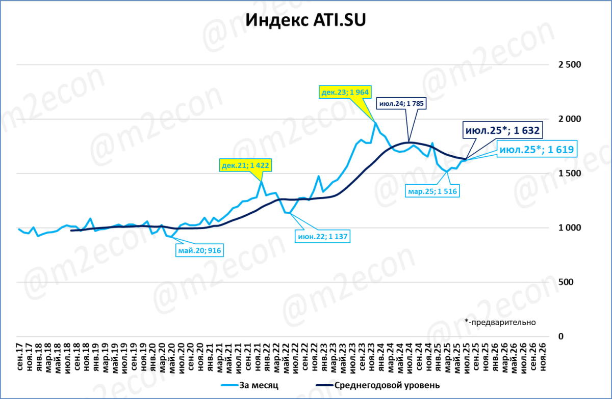 Одним из известных индексов, отражающих цены на автоперевозки, является индекс ATI.SU Индекс еженедельный. Чтобы перейти на месяцы, мы взяли последние значения каждого текущего месяца.