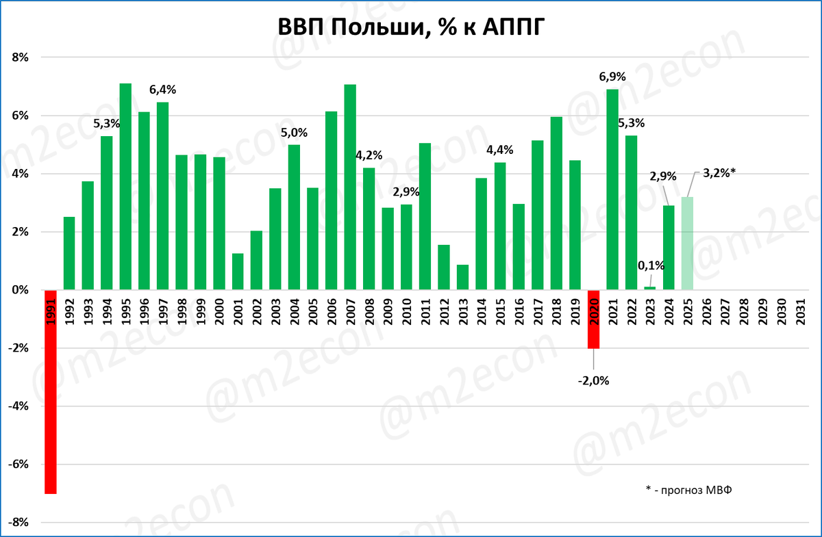 ВВП Польши почти ни разу не падал после 1991 года, за исключением ковидного 2020 года.
