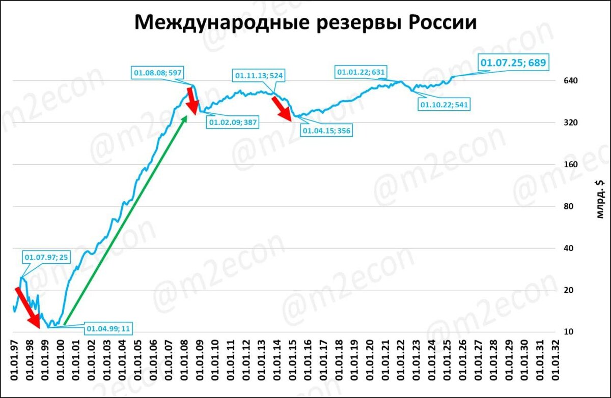 — Сокращения резервов (показаны красными стрелками) совпадают с кризисами и падениями ВВП.