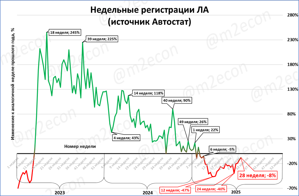 Регистрации легковых автомобилей на 28 неделе составили 24,2 тыс. (-8%). Данные за эту неделю позволяют повысить оценку июля с 123,4 до 126,8 тыс. Падение в июле замедлится до -7% (после -28% в июне).