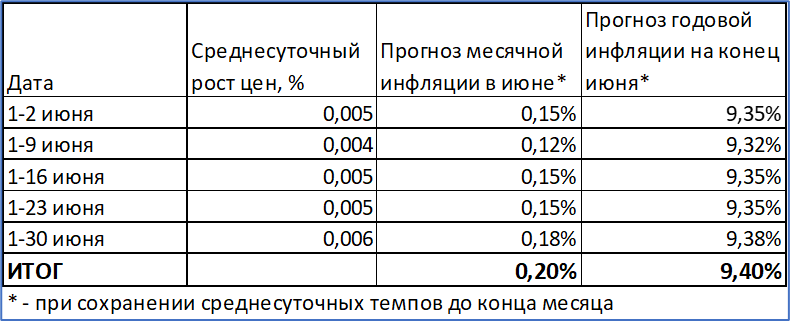 Такой высокий рост цен связан и повышением тарифов ЖКХ. В последующие недели рост будет заметно меньше. Но если бы такой рост продлился до конца месяца, то инфляция по итогам июня составила бы 11,90% годовых.