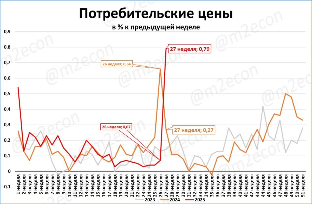 Восемь недель подряд недельный рост цен был ниже, чем за аналогичную неделю прошлого года (на следующем графике красная линия была ниже оранжевой). Но 27 неделя прервала эту череду. Цены выросли сразу на 0,79%.
