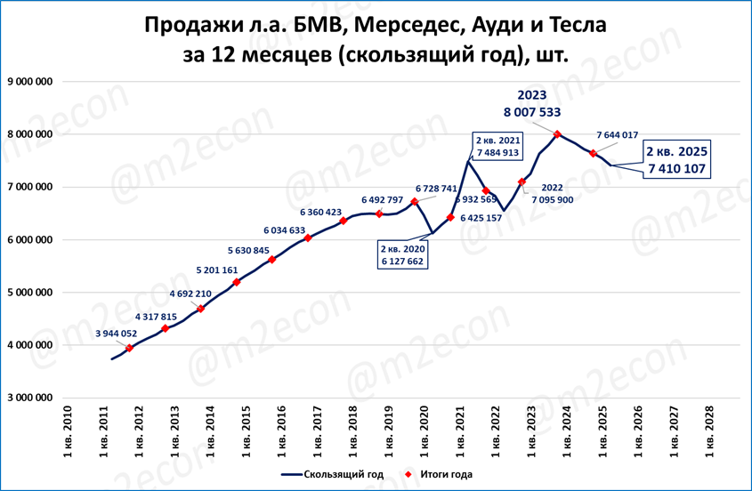 Глобальные продажи автомобилей трёх немецких марок (Ауди, БМВ, Мерседес) стагнируют уже давно. Уровня 6,2 — 6,4 млн. штук в год они достигли ещё в 2017 году, и с тех пор не растут.