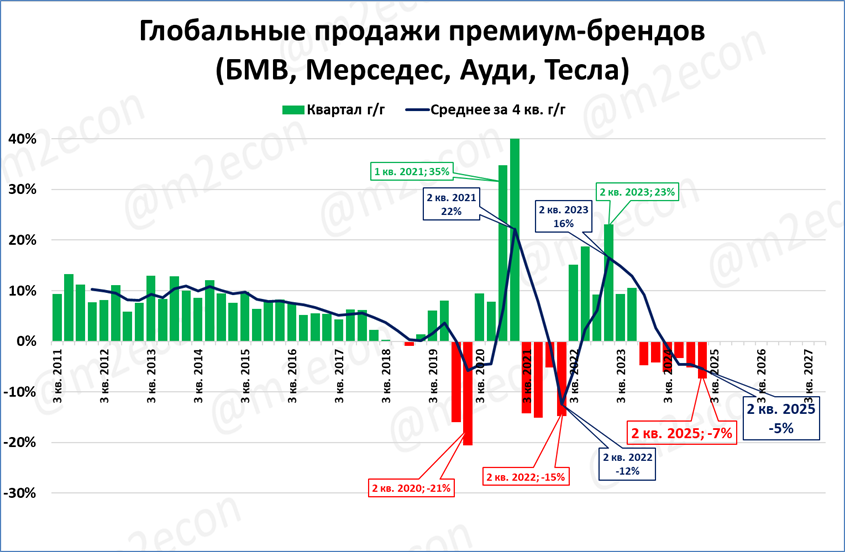 Можно было бы предположить, что падение продаж премиум-автомобилей «предсказывает» замедление мировой экономики (по данным МВФ с 3,3% в 2024 до 2,8% в 2025). Например, продажи премиум-автомобилей стали сжиматься ещё в первой половине 2008 года, ещё до того, как разразился мировой финансовый кризис.