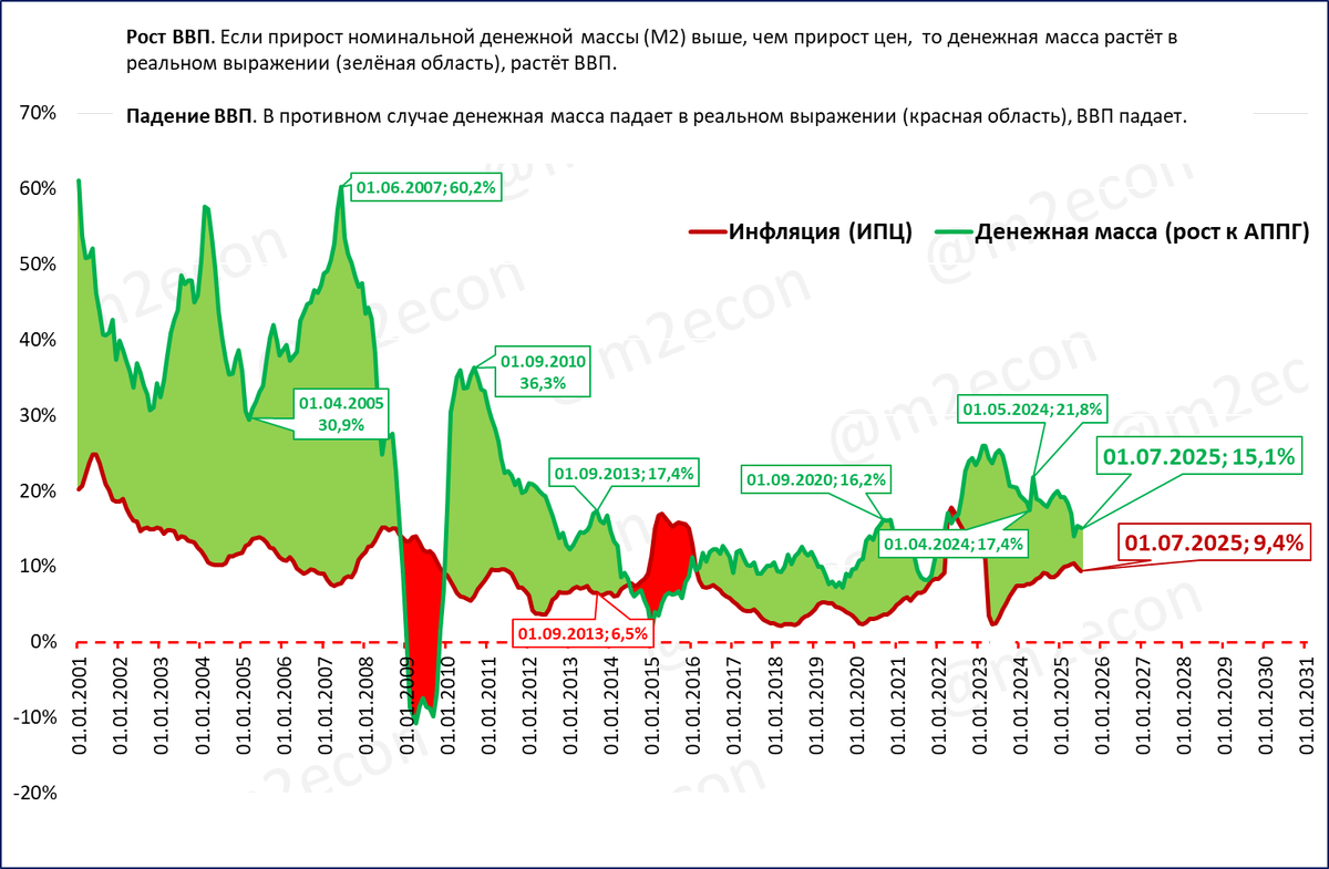Темп роста денежной массы с 26% в феврале 2023 года снизился до 15,1% на 1 июля 2025. Инфляция при этом растёт последние 2 года.