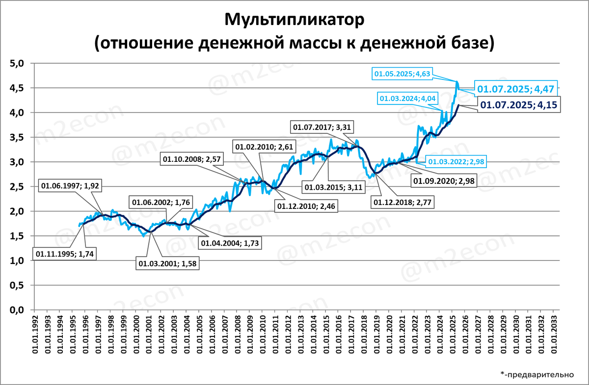 Рост мультипликатора говорит о том, что денежная масса растёт не благодаря, а вопреки.