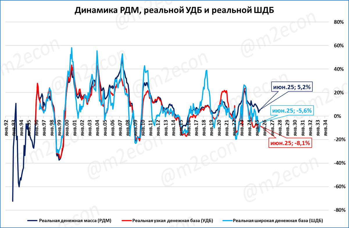РДМ пока растёт, несмотря на сжатие реальной денежной базы. Но кто бы сомневался, что ЦБ добьётся сжатия реальной денежной массы, если продолжит зажим денежной базы.