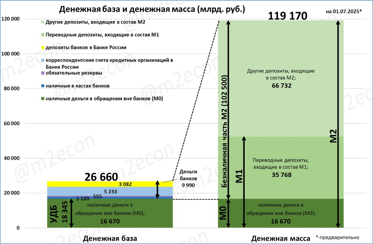 Денежная масса на 1 июля 2025 года установила исторический рекорд и составила 119,2 трлн рублей.