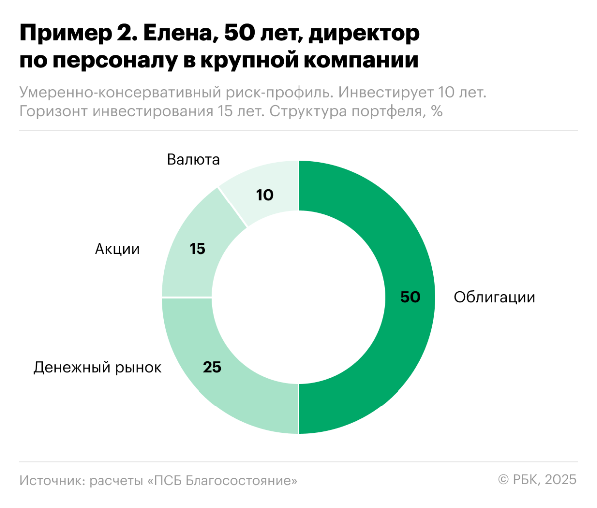 На долгосрочном горизонте инвестирования можно создавать более рисковые по своей структуре портфели. Например, портфель 20-летнего инвестора может содержать больше акций, так как у него длиннее горизонт для восполнения возможных убытков. А человек предпенсионного возраста не может позволить себе крайне рискованный портфель. Поэтому для более зрелых инвесторов важно сосредоточиться на более стабильных и менее волатильных активах.