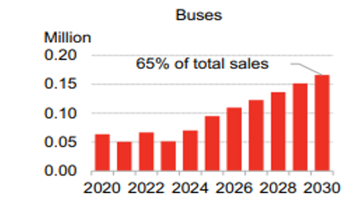 Мировой тренд на электрификацию общественного транспорта. По данным BloombergNEF, к 2030 году около 65% всех новых автобусов будут электрическими. Это создает масштабный и устойчивый спрос на продукцию Yutong. Mатериковый Китай, страны Северной Европы и Южная Корея при сохранении текущих рыночных условий достигнут полностью электрического парка городских автобусов до 2040 года.