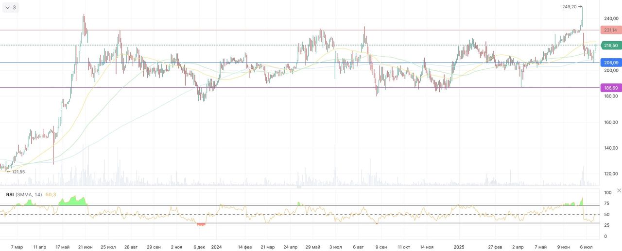 На дневном графике после отработки дивидендного гэпа котировки привилегированных акций «Ленэнерго» отскочили от нижней границы бокового коридора в районе 206 руб. Ближайшей целью роста выступает 50-дневная скользящая средняя, проходящая на уровне 222 руб. Пробой этого уровня откроет путь к восстановлению в направлении верхней границы диапазона на отметке 231 руб.