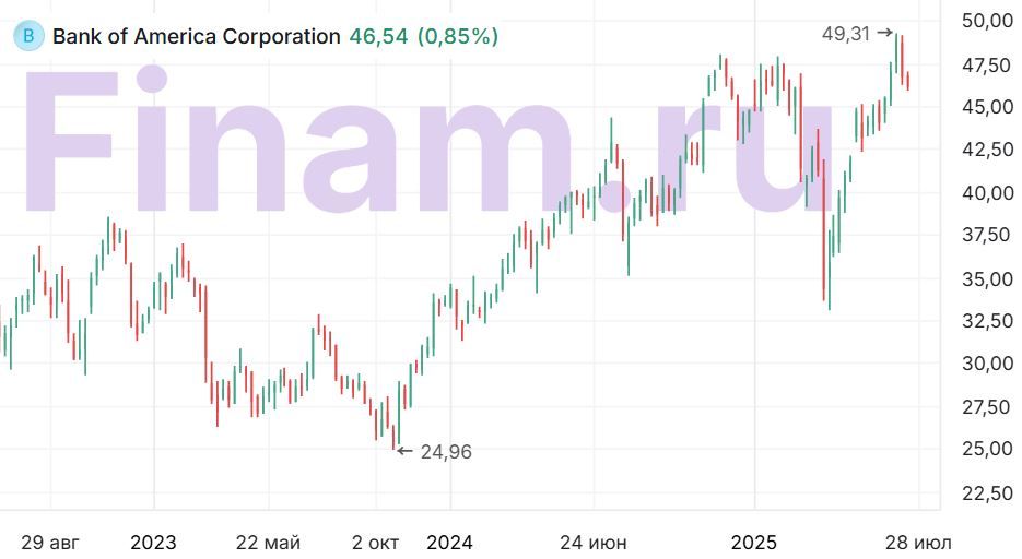 Bank of America, второй по величине американский финансовый конгломерат, опубликовал в целом неплохие финансовые результаты за II квартал 2025 г. Чистая прибыль кредитора увеличилась на 3,2% г/г до $7,1 млрд, или $0,89 на акцию, и на 3 цента превзошла среднюю оценку аналитиков Уолл-стрит. Квартальная выручка банка выросла на 4,3% г/г до $26,5 млрд, но немного не дотянула до консенсус-прогноза на уровне $26,7 млрд. Чистый процентный доход поднялся на 7,1% до $14,7 млрд благодаря заметному увеличению кредитования при относительно стабильном показателе чистой процентной маржи, а непроцентные доходы повысились на 1% до $11,8 млрд.