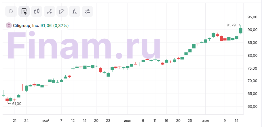 Чистая прибыль Citigroup во II квартале 2025 г. подскочила на 24,9% г/г, до $4 млрд, при этом EPS на уровне $1,96 существенно, на 35 центов, превысил среднюю оценку аналитиков Уолл-стрит. Квартальная выручка поднялась на 8,2% г/г, до $21,7 млрд, и также превысила консенсус-прогноз на отметке $20,9 млрд. Рост доходов был зафиксирован во всех основных сегментах. В том числе чистый процентный доход увеличился на 12,7%, до $15,2 млрд, на фоне роста кредитного портфеля и улучшения чистой процентной маржи (на 10 б. п., до 2,51%). Операционные расходы подросли на 2,5%, до $13,6 млрд, примерно на уровне инфляции. Между тем определенное сдерживающее влияние на прибыль оказал ощутимый рост расходов на кредитный риск — на 16%, до $2,9 млрд. Руководство Citigroup немного улучшило прогнозы на весь 2025 г. и ожидает общую выручку порядка $84 млрд (вблизи верхней границы прежнего прогнозного диапазона $83,1–84,1 млрд), что предполагает увеличение на 3,5% от показателя прошлого года. В том числе ожидается 4%-е повышение чистого процентного дохода.