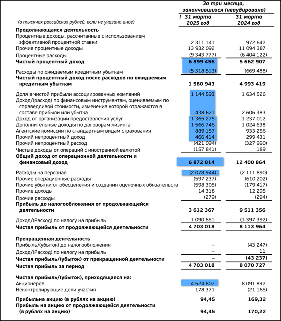 В отчете 1Q 2025 наиболее значимое –рост в 8 раз до 5,3 млрд расходов по резервам. Это расходы Европлана из-за ожидания убытков по сделкам с низкими авансами (которые заключались под 0–10% в 2023–2024 годах). Ещё в 6 раз упал доход от переоценки акций МВидео. Из-за этого ЧП упала в 1,8 раз.