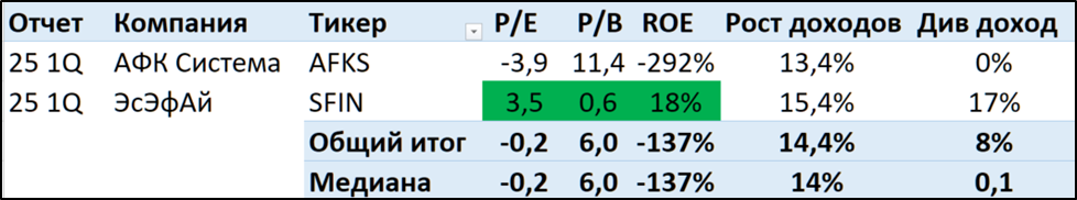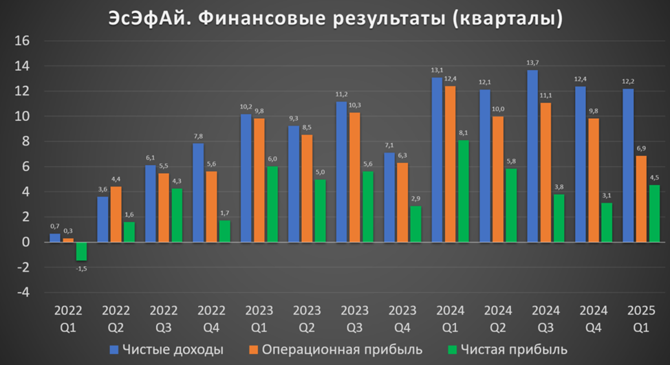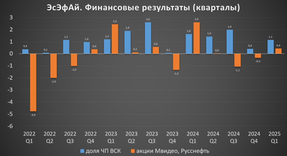 Как уже отмечалось, отчет SFI в основном отражает результаты Европлана, который на фоне высокой ключевой ставки не смог удержать высокие темпы роста. Но отдельно отметим результаты от прочих активов. Видим, что ВСК в целом прибылен, но результаты не очень нестабильны. А стоимость акций МВидео (плюс до 3Q 24 Русснефти) сильно колеблются. Но в 2025 1Q они были положительны.