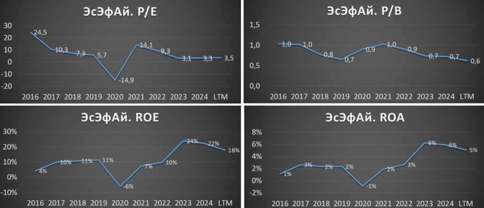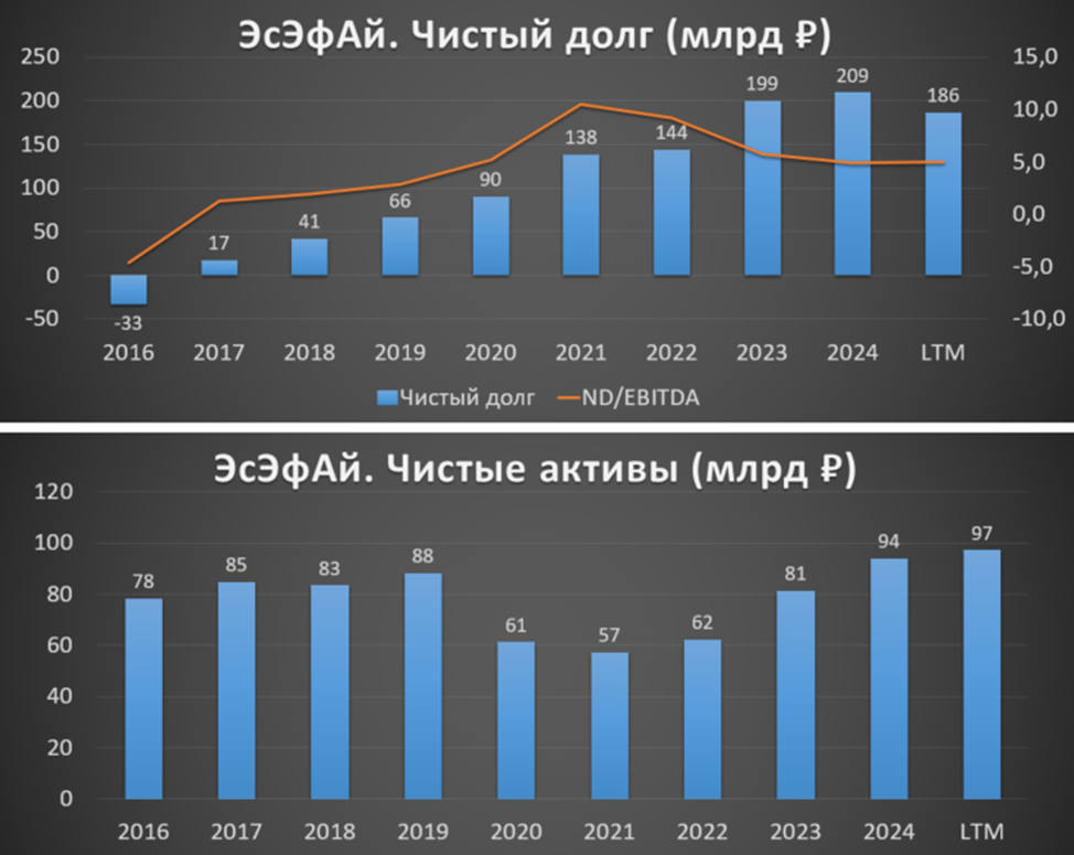 Чистый долг SFI 186 млрд (-11%). Весь долг приходится на Европлан, причём он покрывается лизинговыми активами (машинами). А у SFI, как корпоративного центра, чистый долг отрицательный. К слову, 01.04.25 «Эксперт РА» повысило кредитный рейтинг ПАО «ЭсЭфАй» до уровня ruAA- со стабильным прогнозом.