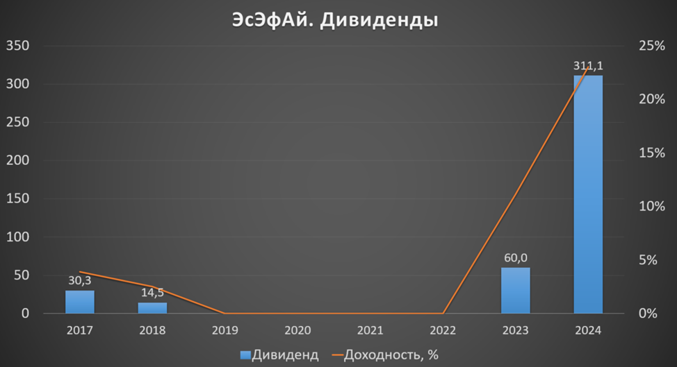 Акции SFI торгуются на бирже уже почти 10 лет. Но особенный интерес к ним был в прошлом году, когда на слухах о погашении казначейского пакета они взлетали более, чем в 3,5 раза. Но на текущий момент котировки на 42% ниже максимумов. И уже год цена акций находится в боковике.