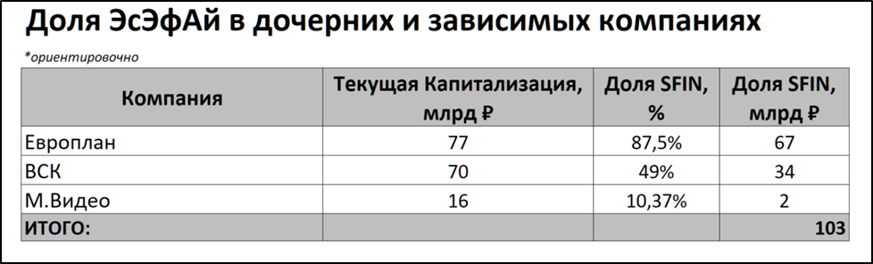 На данный момент SFI владеет 87,5% акций лизинговой компании «Европлан», 49% страховой компании ВСК. Плюс есть доли в публичной компании «М.Видео-Эльдорадо» (доля 10,4%). Еще была доля 11,2% в нефтяной компании "Русснефть", но в прошлом году SFI сократила ее до нуля.