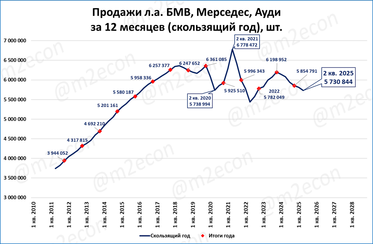 Глобальные продажи автомобилей трёх немецких марок (Ауди, БМВ, Мерседес) стагнируют уже давно. Уровня 6,2 — 6,4 млн. штук в год они достигли ещё в 2017 году, и с тех пор не растут.