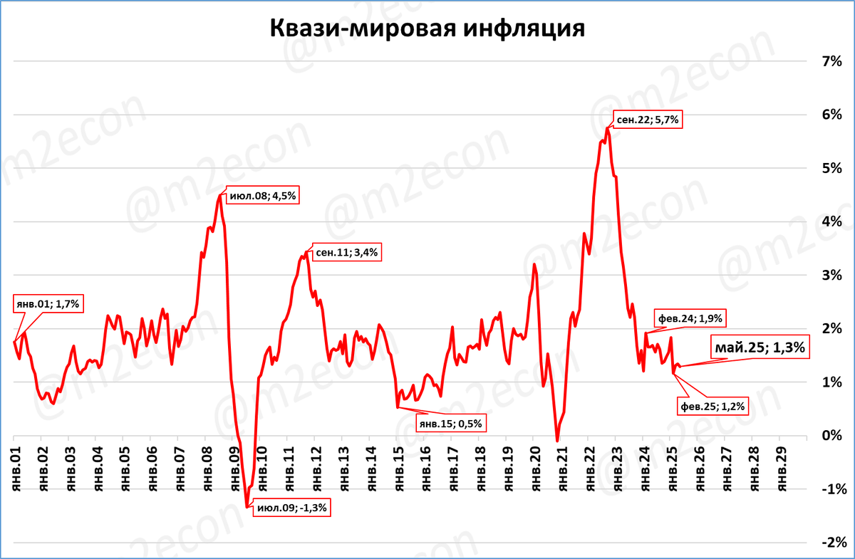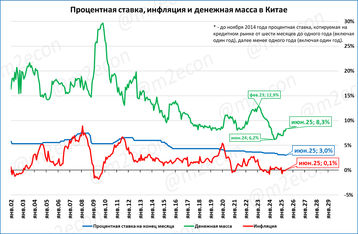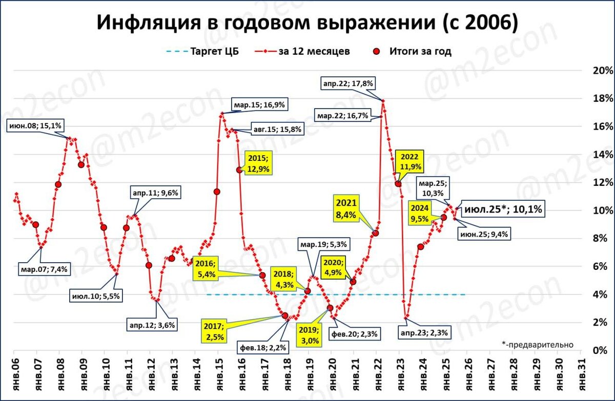 Но среднегодовые темпы (синяя линия на графике) до последнего времени снижались из-за предыдущего замедления темпов роста в апреле 2023 — августе 2024 с 12% до 5,7%. Только сейчас начинается рост среднегодовых темпов.