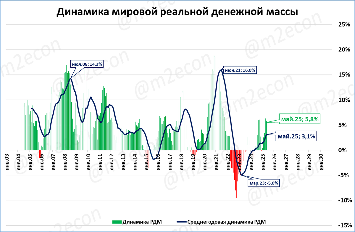 По нашим расчётам, мировая реальная денежная масса по итогам мая месяца выросла на 5,8% в годовом выражении.