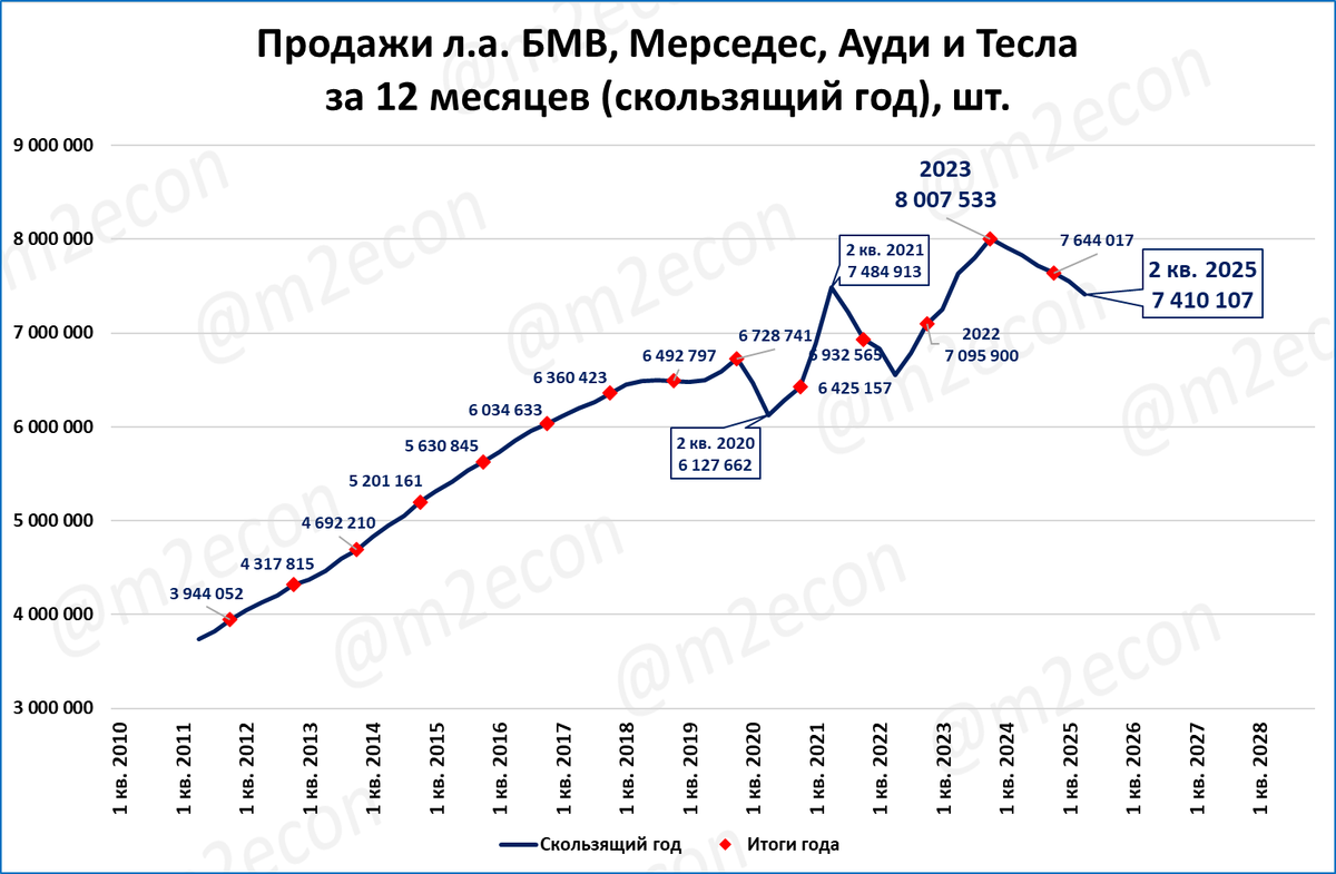 Суммарные продажи четырёх производителей (трёх немецких марок Ауди, БМВ, Мерседес вместе с американской Тесла) достигли пика в 2023 году.