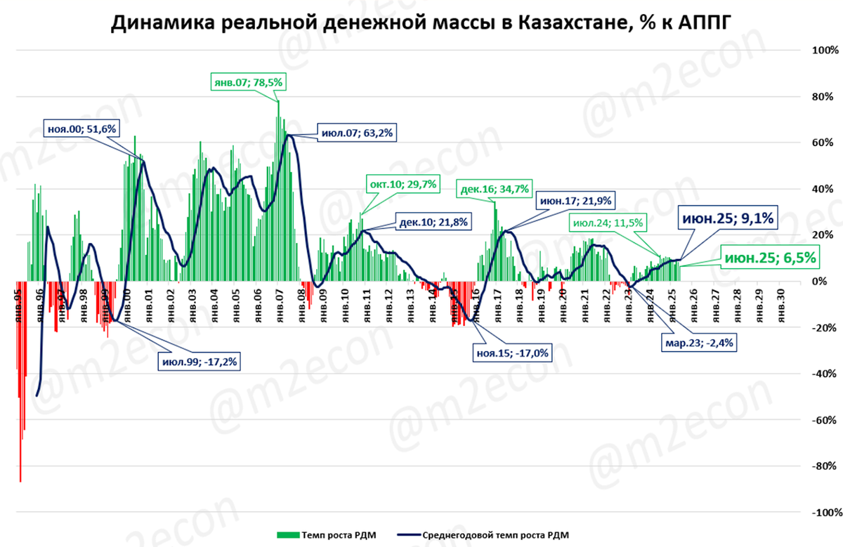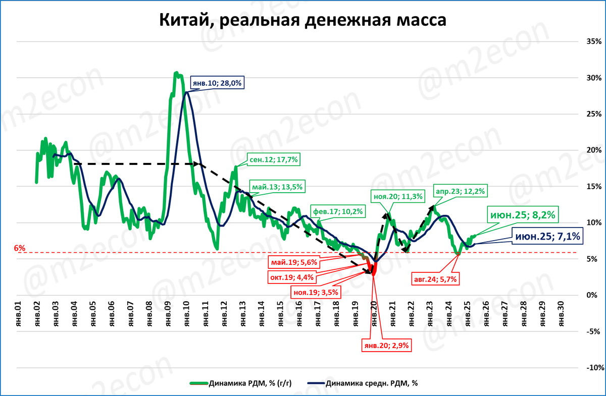 Как видно на графике, рост РДМ с августа 2024 года постепенно ускоряется (зелёная линия на графике).