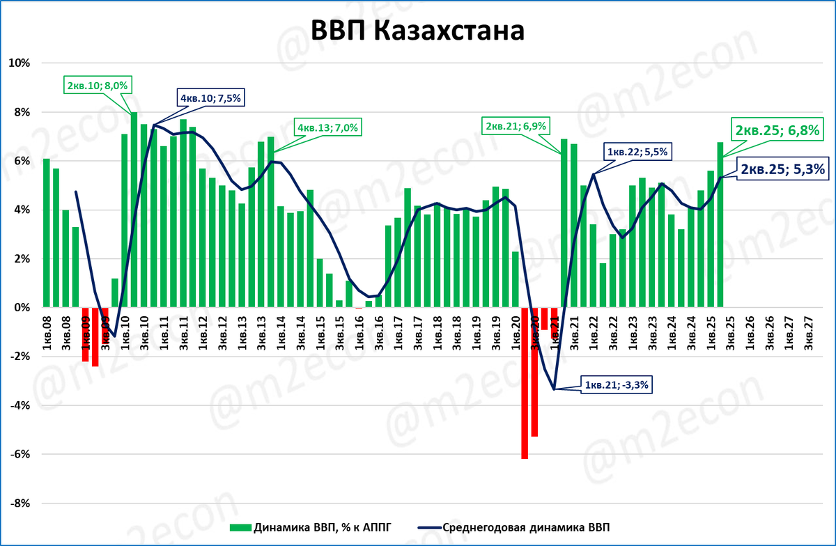 ВВП Казахстана по итогам января-июня составил 6,2 %. По нашим расчетам за 2 квартал ВВП вырос на 6,8%.