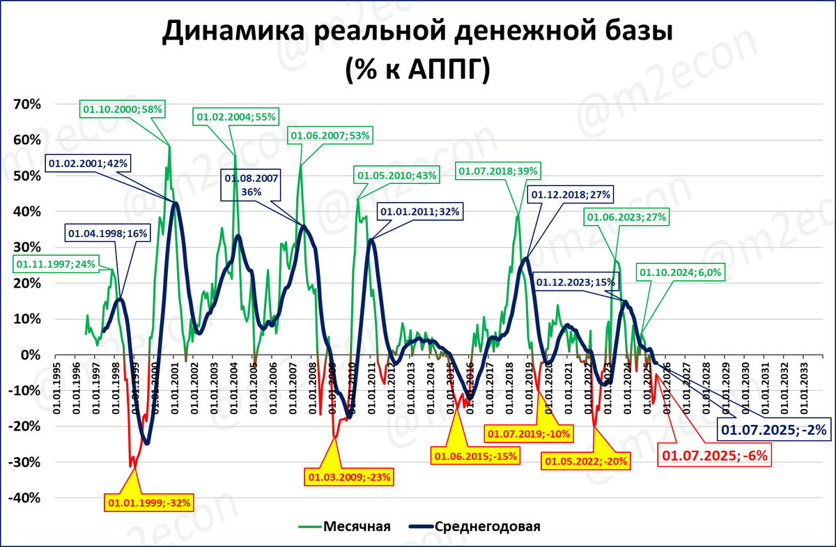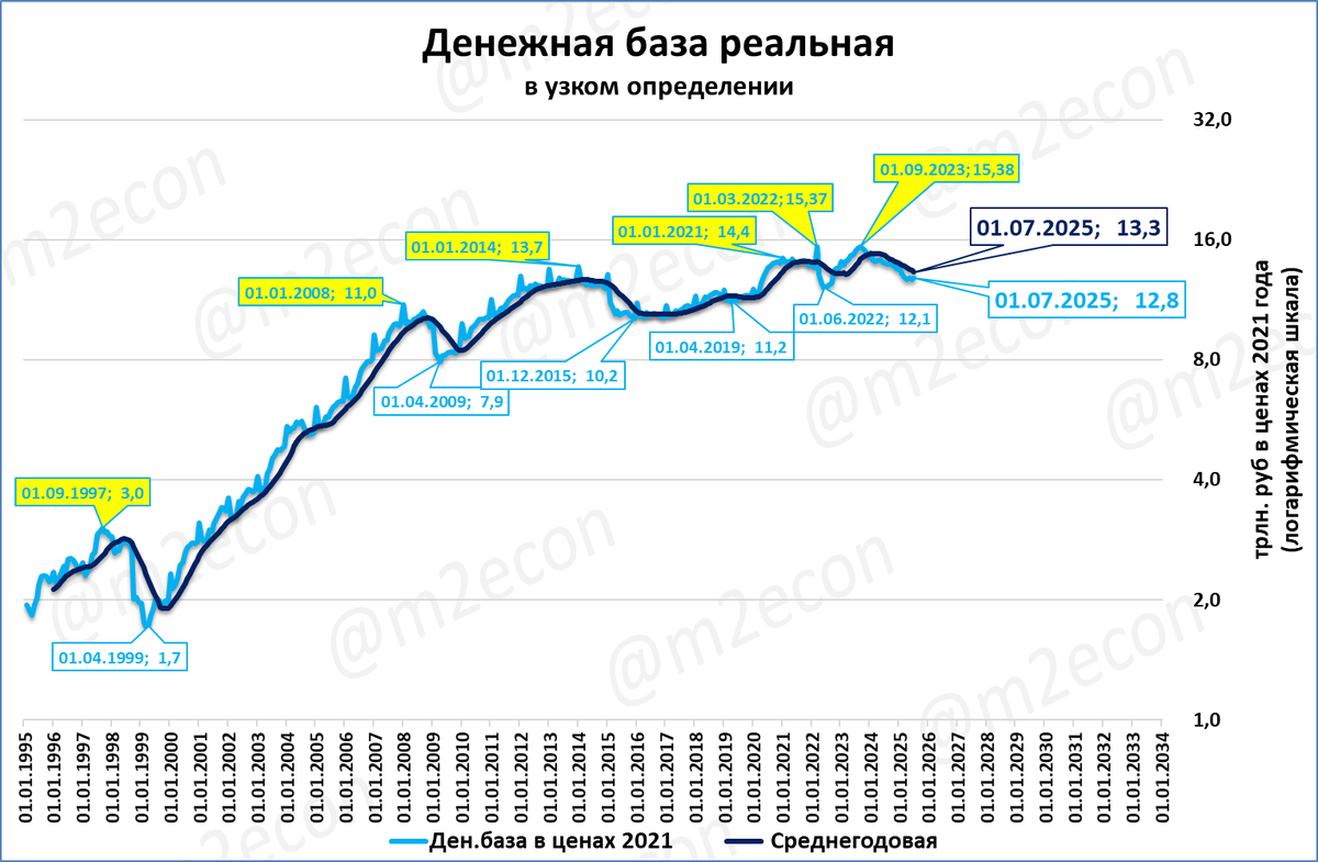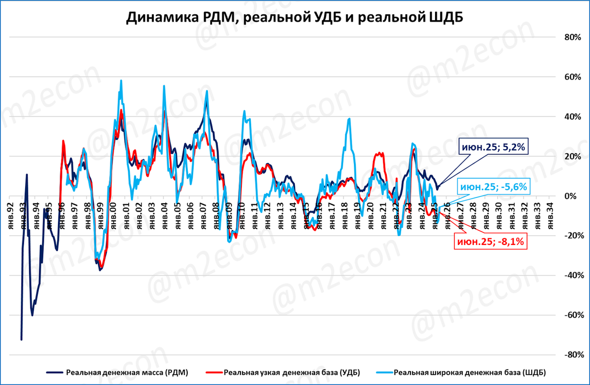На 1 июля 2025 года реальная денежная база на 6% ниже, чем год назад.