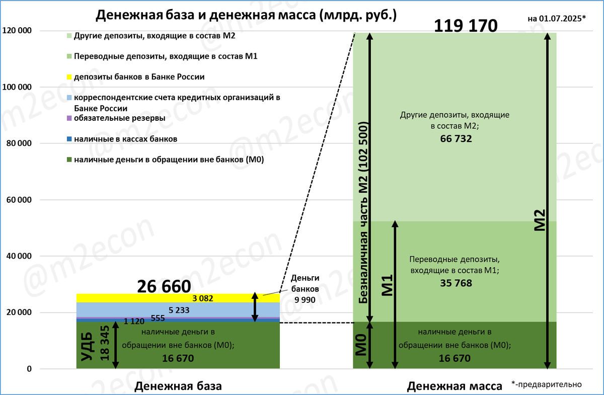 На 1 июля 2025 года широкая денежная база составила 26,66 трлн рублей.
