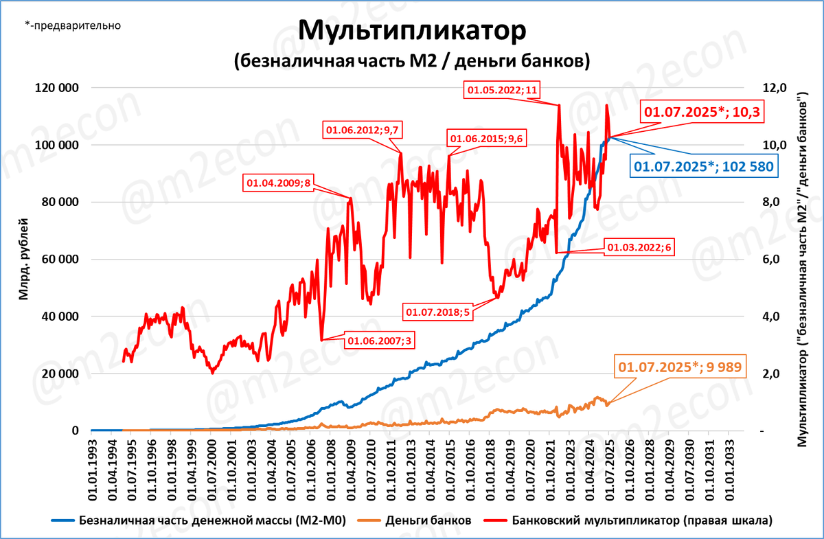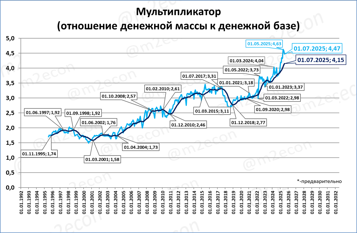 В мае 2025 года денежный мультипликатор установил исторический рекорд (4,63).