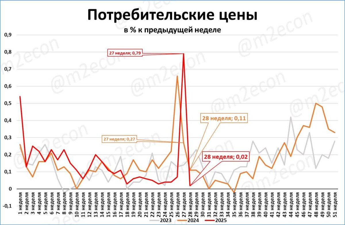 За 28 неделю года цены выросли на 0,02%. Это намного ниже, чем за 28 неделю 2024 года (0,11%).
