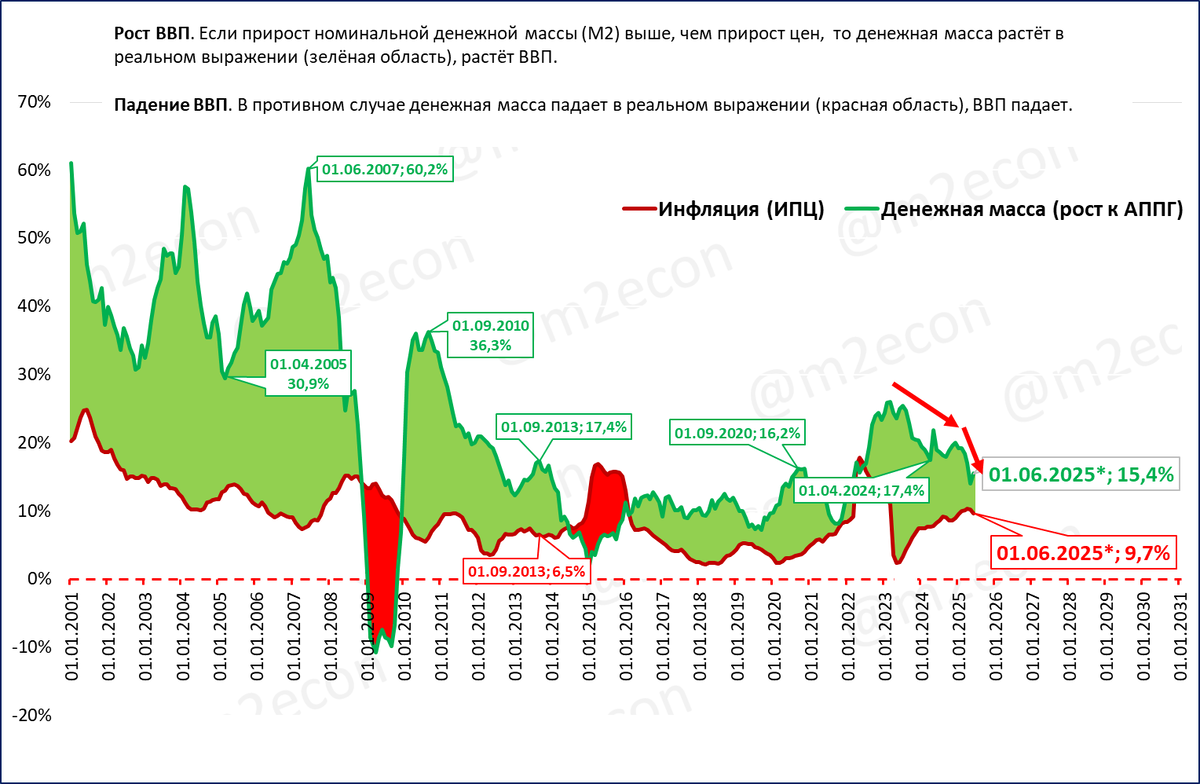 Напомним, что для роста экономики важна не инфляция сама по себе. Важно, насколько денежная масса опережает инфляцию (= насколько растёт реальная денежная масса, РДМ).