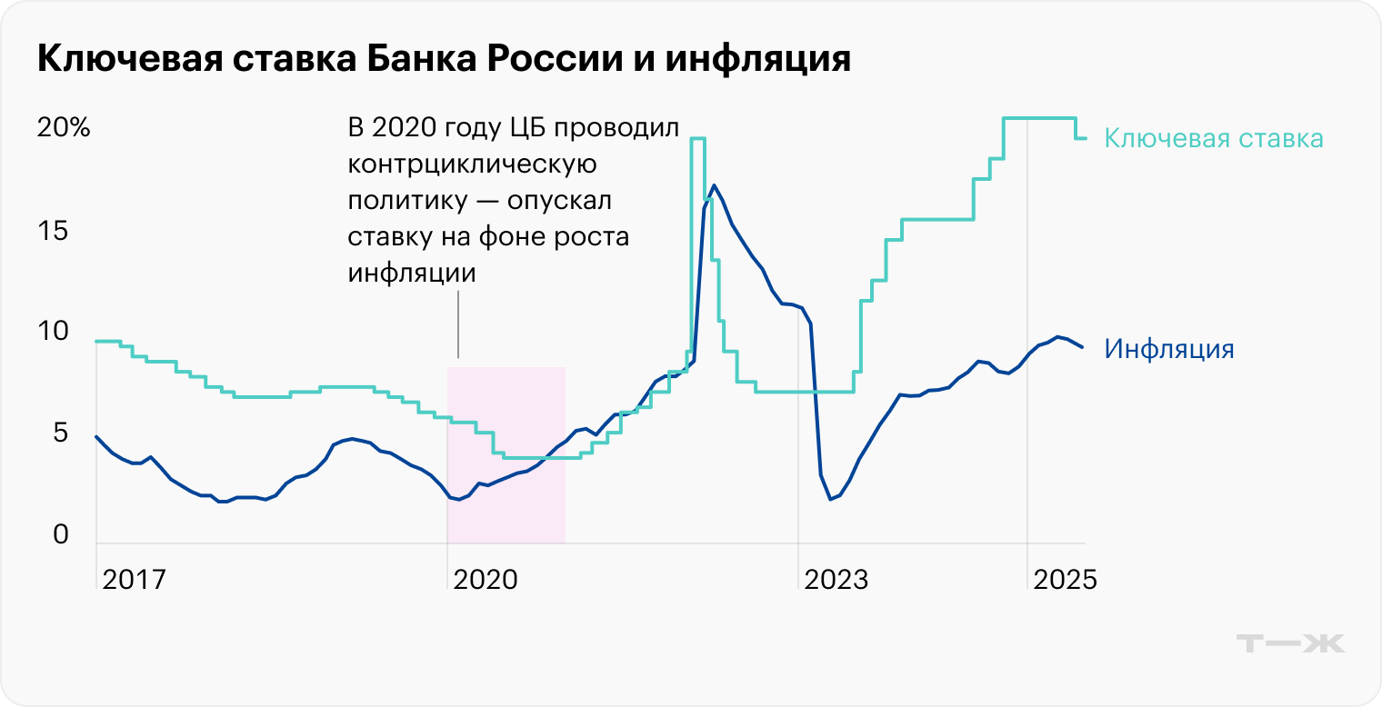 На этом рекордно высоком для России уровне ключевая ставка продержалась до лета 2025 года. В июне ЦБ опустил ее до 20%, отметив охлаждение внутреннего спроса и замедление инфляции.