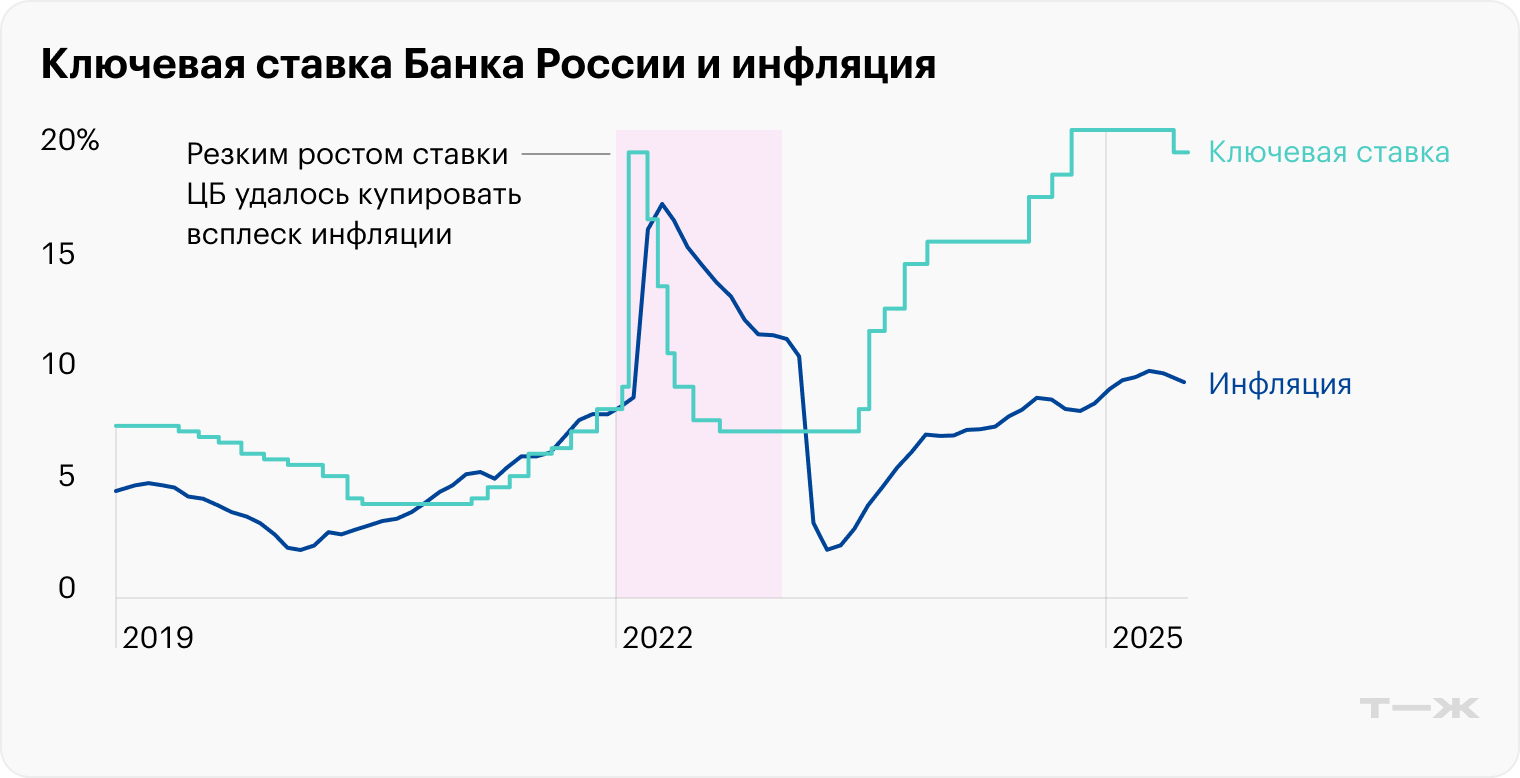 Из-за снижения цен на нефть и санкций, закрывших для России международные рынки капитала, в стране возник дефицит валюты: люди и бизнес начали активно ее скупать. Чтобы сбить этот спрос и потребительский ажиотаж россиян, которые пытались спасти сбережения от инфляции, ЦБ резко повысил ставку, сделав деньги дороже. Когда инфляция утихла, ставку начали снижать.
