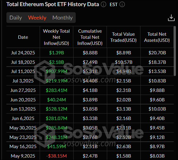 Приток денежных средств в спотовые ETF на эфир фиксируется вот уже пятнадцать торговых сессий подряд. Начиная с 16 мая только в четырех случаях наблюдался отток денег. Суммарно за прошедшую неделю биржевые фонды пополнились на $1,39 млрд. Таким образом, спрос на вторую по капитализации криптовалюту со стороны институциональных инвесторов остается высоким.