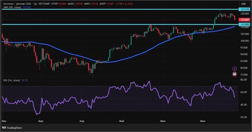 С точки зрения технического анализа, тренд биткоина остается восходящим. Об этом свидетельствуют индикаторы: цена превышает 50-дневную скользящую среднюю (обозначена синим цветом), RSI хоть и снизился, но все еще выше уровня 50. Ближайшими уровнями поддержки и сопротивления на дневном графике выступают отметки $112 000 и $123 236 соответственно.