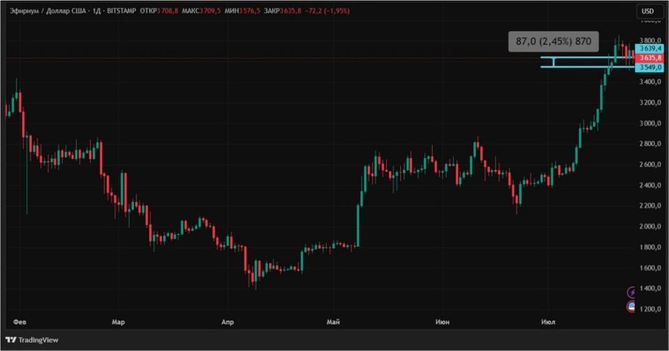 В отличие от биткоина, эфир продемонстрировал с 18 по 25 июля рост — 2,45%. 20 июля стоимость ETH впервые в году превысила $3 800. Однако удержаться выше этой отметки эфиру пока не удалось.