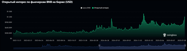 Рост Binance Coin также связан с ростом спроса на деривативы. Если неделю назад показатель открытого интереса, количества контрактов в обращении на биржах по фьючерсам составлял $934,78 млн, то 25 июля показатель поднялся до $1,15 млрд. Иными словами, за семь дней прирост составил 23%.
