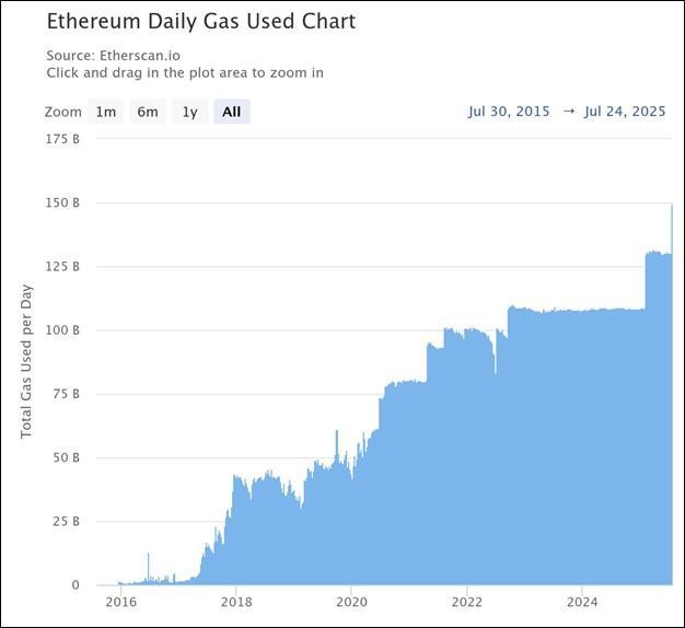 После достаточно долгого застоя показатели сети Эфириума демонстрируют рост. Количество использованного газа достигло исторических максимумов. 23 июля значение превысило 162,4 млн. Такое положение дел объясняется не только увеличением количества транзакций непосредственно с эфиром, но также операциями со стейблкоинами: USDT и USDC. По сравнению с показателями начала июля, количество использованного газа за день увеличилось почти на 25%.