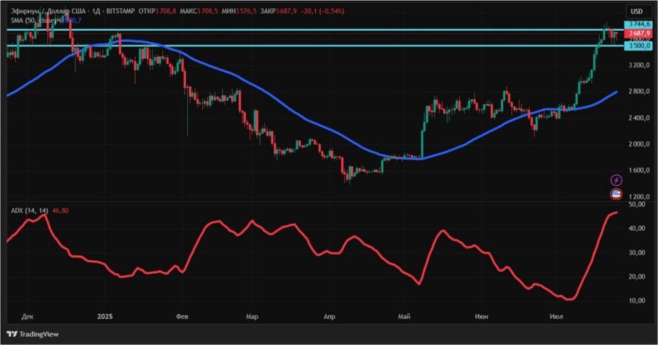 Несмотря на некоторое отступление от годовых максимумов, тренд остается восходящим. Цена находится выше 50-дневной скользящей средней (обозначена синим цветом). Кроме того, тренд достаточно сильный, учитывая, что индикатор ADX — выше значения 40 (46,8). Ближайшие уровни поддержки и сопротивления по дневному графику: $3 500 и $3 744,6 соответственно.
