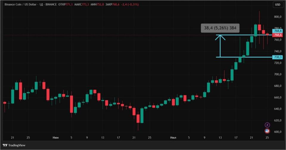 Более 5% прибавила BNB c 18 по 25 июля. Знаковое событие для криптовалюты произошло в среду, 23 июля: она обновила свой исторический максимум. Новое пиковое значение составляет $810,2 — по данным выпускающей монету биржи Binance.
