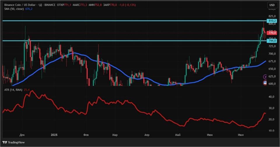 С точки зрения технического анализа, BNB — в восходящем тренде. В пользу этого говорит превышение ценой 50-дневной скользящей средней (отмечена синим цветом). При этом волатильность криптовалюты со второй недели июля увеличилась. Об этом говорит более чем двукратный рост индикатора ATR. Уровни поддержки и сопротивления на дневном графике: $744 и $810,2 соответственно.