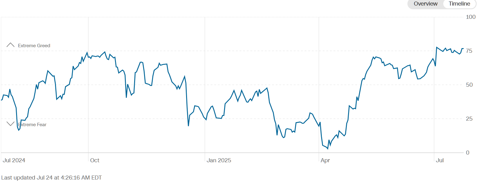 Если посмотреть на настроения регулятора, то тут всё по-прежнему - два снижения ключевой ставки до конца года. И это при условии давления президента на ФРС. Да, намедни была встреча Пауэлла и Трампа непосредственно в штаб-квартире ФРС. Может быть, на заседании 30 июля мы наконец-то увидим сюрприз в виде более агрессивного снижения ключевой ставки. Может быть это входит сегодня в ожидания участников рынка, которые так охотно толкают его на север?